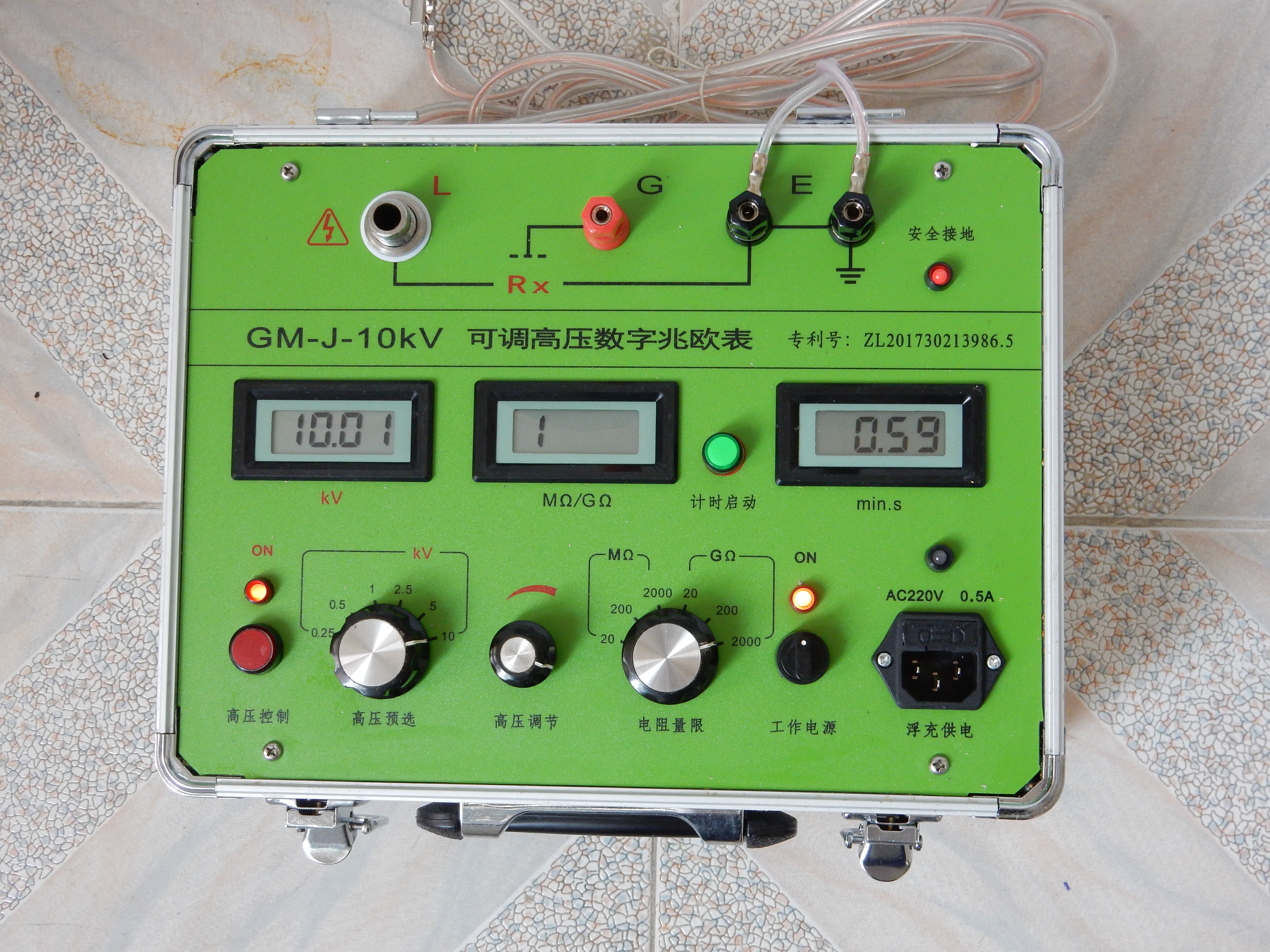 三、大功率可调高压数字兆欧表性能特点1、抗干扰能力强:抗电场感应干扰能力达到2mA(50Hz),已知适应50万伏变电站现场不拆线测量50万伏大型变压器的绝缘电阻参数。 2、短路电流大:短路电流典型值10mA,适应大容量、大电感的测试。 3、电阻测量范围宽广:测量范围从0.01MΩ~1999GΩ,读数准确、分辨力高。 4、高压输出范围宽广:可选择0.25kV、0.5kV、1kV、2.5kV、5kV、10kV,也可从0V平滑调节到需要的电压。 5、声光提醒:具有计时报时功能,提醒使用者记录分析被测量对象的吸收比和极化指数。 6、高品质:关键部件全部采用进口元件,保证测量精度准确。 7、使用方便:采用一体式机箱,体积小、重量轻、便于携带。 8、外观精美:采用坚固且磨性强的材料,使仪器的整体质感和使用寿命更长。 四、 大功率可调高压数字兆欧表技术指标 1、测试电压等级:0.25kV、0.5kV、1kV、2.5kV、5kV、10kV 2、测试电压精度:±(5%+10V) 3、短路电流:典型值10mA 4、量程与准确度 量 程 | 电阻测量有效范围 | 精 度 | 20MΩ | 0.01~19.99MΩ | ±(5%+3d) | 200MΩ | 5.0~199.9MΩ | ±(5%+3d) | 2GΩ | 0.05~1.999GΩ | ±(5%+3d) | 20GΩ | 0.5~19.99GΩ | ±(5%+3d) | 200GΩ | 5.0~199.9GΩ | ±(10%+3d) | 2000GΩ | 50~1999GΩ | ±(20%+10d) |
